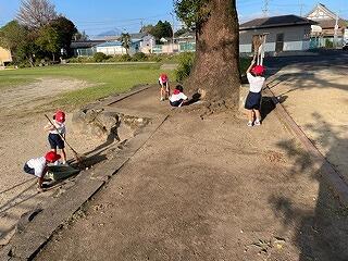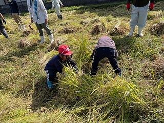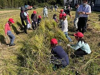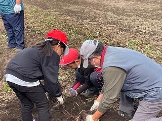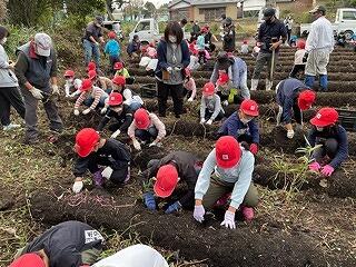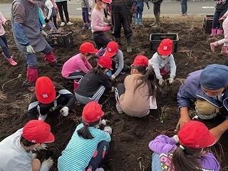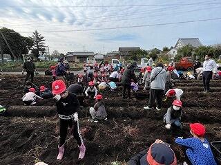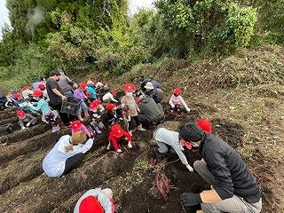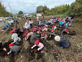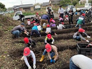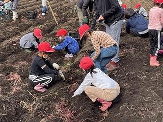 10月27日(木)、1・2年生は営農組合の方々やJAこばやし・野尻の方々に教えていただきながら「いもほり」を行いました。場所は、小学校の西門近くにある「なかよし畑」です。5月23日に芋の苗を植えてから、約5か月間で立派に育ちました。営農組合の方々やJAこばやし・野尻、保護者の方々にまず、黒マルチをはいでもらったり、つるを切ってもらったりしました。その後、組合長さんから芋のほり方を教えてもらいました。芋掘りの時間になると、子ども達は夢中になって、掘り始めました。途中で芋が折れないように、芋の周りを深く深く掘り進めていきました。そして、無事に収穫できると、「わあ、大きいのがほれた!」「僕のは長いのが芋だよ!」「わたしのは太さが太いわ!」とほった芋の大きさや長さ、重さを友だちと比べながらとってもいい笑顔で掘り進めていきました。ひろ~い芋畑が、たった1時間ほどで、全て掘り終わることができました!ほった芋はその日の内に、営農組合の皆さんで袋に小分けして頂き、一人約2kgずつ持ち帰ることができました!今日は、芋御飯かな?焼き芋かな?それとも大学芋?家庭での食卓が目に浮かぶようです!みんなよく頑張って掘りました!協力頂いた皆様、ありがとうございました!