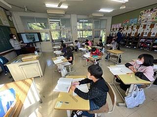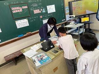 2年生は算数の練習問題に取り組んでいました。問題を解いたら1人1人先生に見せて、丸をもらったら学び合い学習に入るようです。
