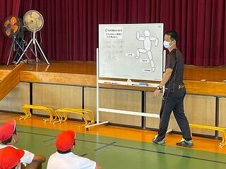 7月21日(木)、全校集会がありました。新型コロナウイルス感染症防止の観点から、放送室と各学級をつなぐリモート形式で行いました。校長からは、まず今年度の合言葉「きらきら」「にこにこ」「ぐんぐん」の3つについて、守れたかどうかの確認がありました。「今までのところ、100点?90点?80点?、、、」と順に手を挙げてもらい、100点でなかった人は1学期後半100点を目指そう!と話しました。夏休みの生活については、「楽」と「命」の漢字をもとに、「夏休みを楽しんでほしい、そのために、計画をたてよう!」「124の命を絶対にもってきてほしい、そのために、夏休みのきまりをしっかり守ってほしい」と話しました。その後、生徒指導の先生から、夏休みの生活のきまりについて「火」「水」「車」「命」の4つのキーワードで注意を呼びかけました。最後に、体力テストで「A」判定をもらった児童の表彰を行いました。