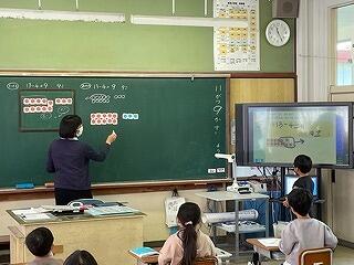 11月9日(水)、1年生の研究授業がありました。算数のひき算の勉強でした。「13-4の計算の仕方を考えよう」というめあてで、タブレットをつかって考え方を図に表し、答えを導き出した方法をペアで伝え合い、考えを全体で練り合いまとめていきました。今回の研究授業は野尻中学校区小中一貫教育研究会の授業研究会でもあったので、栗須小や野尻中からも校長先生をはじめ、たくさんの先生方が授業をみにこられました。子供達は授業開始時からやる気に満ちあふれていて、いつも以上に頑張る姿が見られました。参観者の先生方からも、たくさんのお褒めの言葉をいただきました。さすが1年生!といわれる授業でした。みんな本当によくがんばりました!