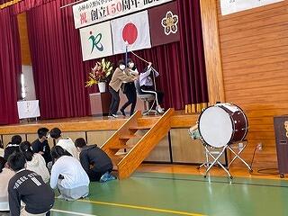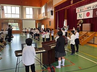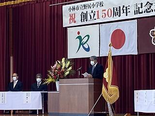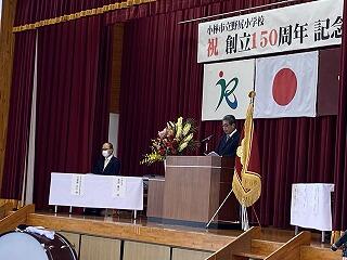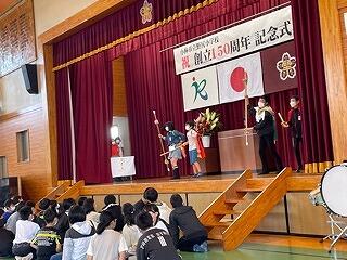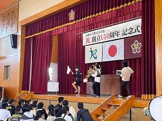 11月12日(土)、小林市長の宮原義久様、小林市教育委員会教育長の中屋敷史生様のご臨席のもと、野尻小学校創立150周年記念式典が開催されました。創立記念事業部長には御挨拶を、小林市長には御祝辞をいただきました。ありがとうございました。式典の後半では、児童の各学年部ごとの発表がありました。1・2年生は150歳になった野尻小学校へお祝いのよびかけと「♩誰にだってお誕生日♩」の歌の発表がありました。両腕を大きくふって元気いっぱい歌う姿や、自分の誕生日月の歌詞で「は~い!」と大きな声を出して立ち上がる姿が見られ、とってもかわいい発表でした。3・4年生は音楽大会で発表する「怪獣のバラード」の合唱と「茶色の小びん」の合奏を披露してくれました。合唱は伸びやかな透き通った声で足でリズムをとりながらのりのりで歌う姿が見られました。合奏は、意気のそろった素晴らしい音色を奏でることができていました。打楽器のピッチに鍵盤ハーモニカやリコーダーがうまくのってすてきなハーモニーを響かせてくれました。音楽大会でもばっちりでしょう!5・6年生は、野尻小の歴史についてこれまで調べたことを呼びかけや、寸劇で発表してくれました。昔ターザン遊びが流行っていたことを紹介するシーンでは、「ア~ア、ア~!!」とステージ袖から出てきたり、運動会のマーチング(鼓笛隊の行進)のシーンを再現したりする場面では会場が笑いに包まれました!会場にいる皆さんのことを考え、上級生らしく工夫して発表することができました。そして、最後はDVD視聴でした。PTA会長が、野尻小の歴史の1ページの写真を1枚ずつチョイスされ、スライドショーにまとめ、BGMに校歌と市民歌をのせた映像をみんなでみました。スクリーンに映し出される映像は野尻小の歴史が1つ1つ刻まれており、昔をなつかしく思い出される方も多かったと思います。子ども達にとっても昔の学校を知る機会になりました。先日撮影したばかりの人文字写真の動画はとても見応えがありました。視聴後は会場が拍手の渦に包まれました。