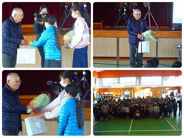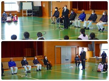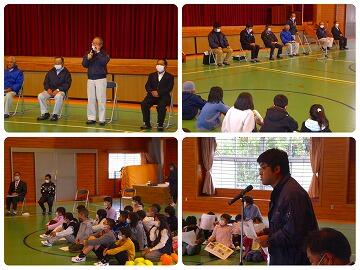 3月1日(月)ボランティア感謝集会を行いました。この1年間、さまざまな活動や場面でお世話になった、東麓新地馬場棒踊り保存会、見守り隊、読み聞かせサークルたんぽぽ、学習支援ボランティアの代表の方々をお招きして行いました。