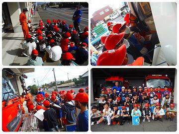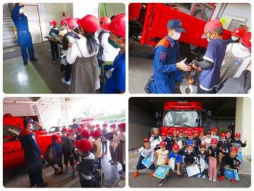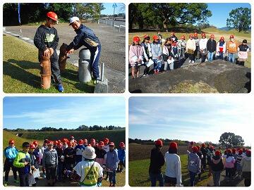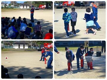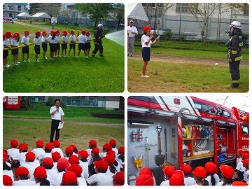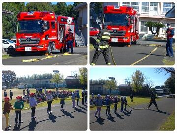 来校していただいた西諸広域野尻分遺所の方から消火器の使い方を教えていただき、6名の児童に体験してもらいました。また、ポンプ車による消火実演も行っていただき、1年生の児童が水がたくさん通ったホースを一緒に握って水圧にびっくりしていました。