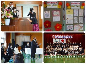 5・6年生による花のアーチをくぐって入場した新入生は、氏名点呼で元気な声で「はい!」と返事をしてくれました。