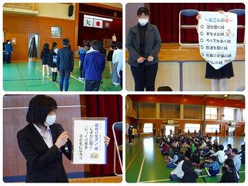 次に、生徒指導の先生から、「火・人・金・遊」をキーワードに冬休みの安全で、きまりよい生活についてお話がありました。