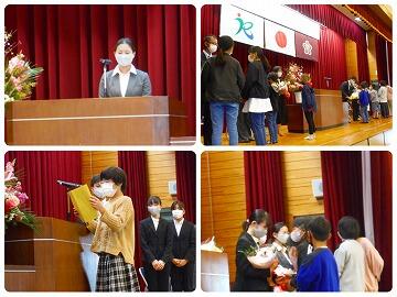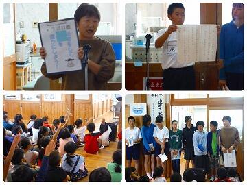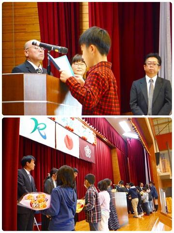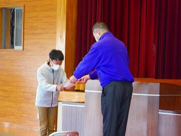 また、東麓新地馬場棒踊り保存会の会長に、校長から賞状を授与しました。東麓新地馬場棒踊り保存会は、長年の功績が認められ、この度「地域学校協働活動」推進に係る県教育長表彰を受賞されました。おめでとうございます。
