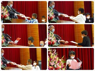 まずは、校長先生が代表児童に修了証を授与しました。その後、児童代表として1年生の桑原悠那さんが一年間を振り返って、思い出に残っている運動会や上手にできるようになった縄跳びのこと、2年生になっても頑張る決意等を発表してくれました。