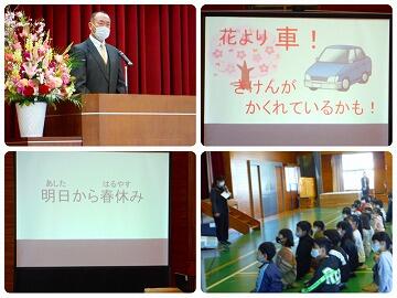 生徒指導担当の先生からも春休みの過ごし方について話がありました。車の多くなる季節です。危ない場所や、新型コロナウイルス感染症対策についても話がありました。ぜひ、ご家庭でも春休みの過ごし方についてご確認ください。