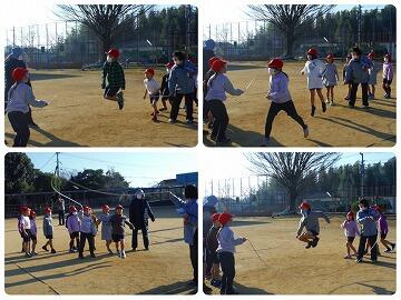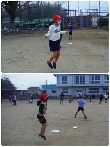 霞がかかった生憎の天気でしたが、それぞれあや跳びや交差跳び、二重跳び等数え合いながら練習していました。