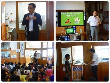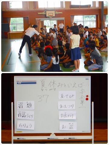 校長先生からは、夏休みの連想クイズが出されました。子どもたちは、校長先生が用意された答えとだいたい同じようなことを回答していました。「やらなければいけないこと」や「やって欲しいこと」、「楽しみなこと」、それぞれありますが、生徒指導の先生からもあったように「火」「水」「人」「車」「金」に気をつけて楽しい夏休みを過ごしてくださいね。