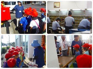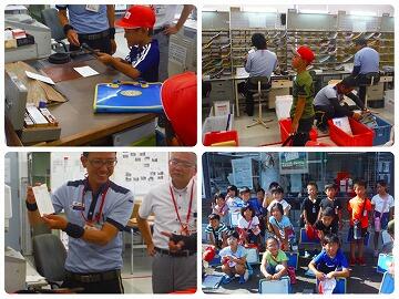 野尻郵便局に集まった郵便物が、消印を押して振り分けられた後、各家庭に配達されるところを見せていただきました。数名の児童が消印を押す体験をさせてもらいましたが、きれいに押印することはとても難しかったようです。郵便局員の方が押印すると、スピードが早く、印字もとてもきれいでびっくりしたようです。