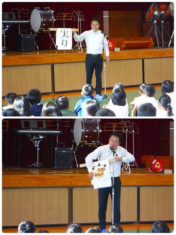 校長先生から「秋と言えば・・・」、よく上がる三つの秋以外に「実りの秋」があるよね、とお話がありました。「実」の字の「うかんむり」は家を表し、その中に「宝」が入っていることを表す漢字だとお話がありました。