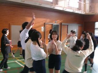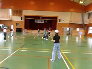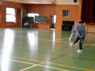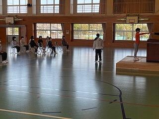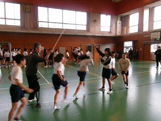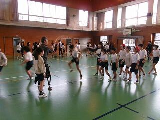 5年生はちょうど学級レクレーションの日で、体育館でクラスみんなで「天下とり」というボールゲームをしていました。ボールの当て合いゲームですが、みんなひるまず立ち向かっていて大いに盛り上がっていました。