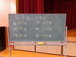 1年生が237回!2年生が163回、3年生が219回!4年生が322回、5年生が391回、6年生が400回でした。自己ベスト記録を1年生、4年生、5年生が叩き出しました!