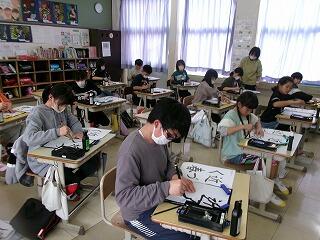 5年生は習字の時間でした!「近づく春」という4文字の中で、しんにょうの書き方に苦労しながらも、お手本通り書こうとがんばっていました!