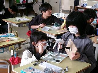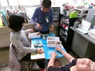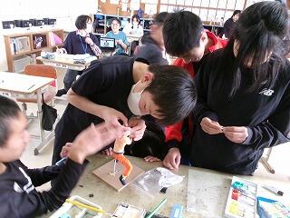 卒業まであとわずかな6年生の図工科の様子です。針金で骨組みつくり、そこに紙粘土をのせ、固まったところに色をつけています。テーマは「未来の私」だそうです。最後の最後まで、細かいところまで丁寧に仕上げています。完成したら教室の後ろの棚にかざるようです!