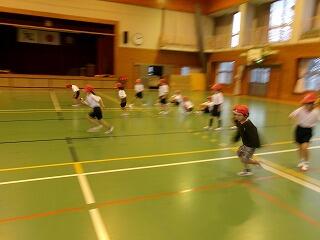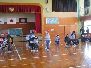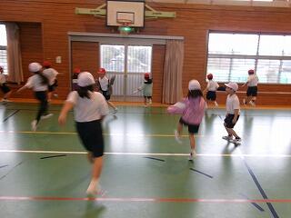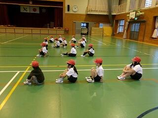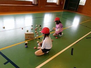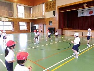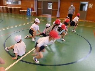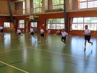1年生は体育館でカラーコーンの折り返しリレーをしていました。コーンをうまく回り、次のお友達にタッチして進んでいきました。チーム対抗戦とあって白熱していました!