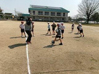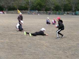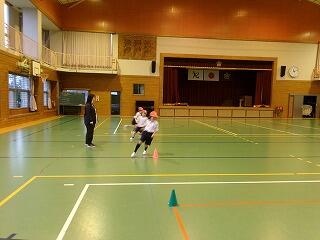 審判はコートを横から見て、ガードするディフェンスが線(鬼ゾーン)から出ていないか、2本ともタグを取られたのに前に進む子はいないかなどを判定します。おもしろいゲーム内容、ルールで授業が大いに盛り上がっていました。すごい運動量でした!鬼遊びもこのように工夫すれば、体育の授業として成立するのですね!この遊びは新スポーツの「タグラグビー」に、そして、ゆくゆくは「ラグビー」に発展していくそうです!