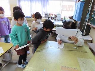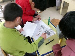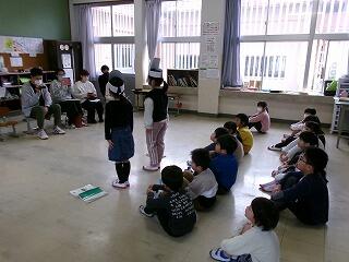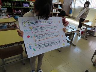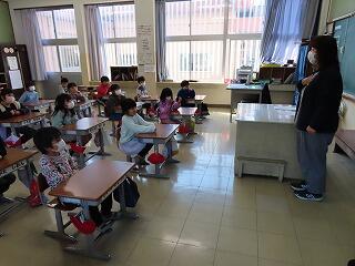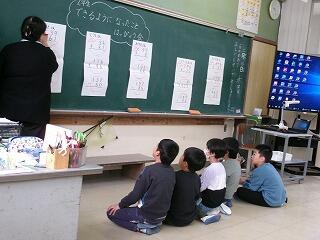 1年生は今週金曜日にある6年生とのお別れ集会の発表の練習をしていました。よびかけの内容について紙を見ながらセリフを確認していました。