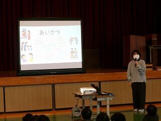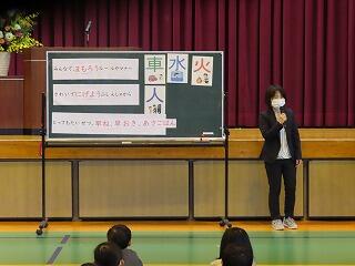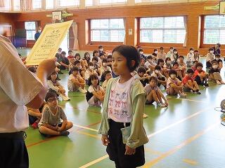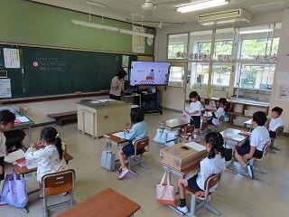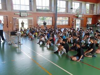 7月19日(金)。今日は夏休み前の最後の登校日。朝の時間に全校朝会が行われ、校長と生徒指導担当から子どもたちに向けて、安全で楽しい夏休みが過ごせるようにスライドを使ってのお話がありました。