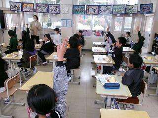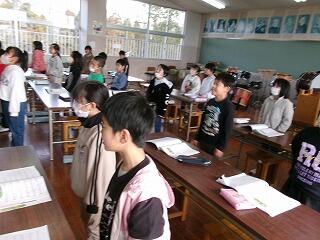 野尻小学校では3年生児童が卒業式に出席します。今日、3年生の音楽の授業をのぞいてみると、卒業式で歌う「君が代」の歌の練習をしていました。先生が歌詞を読み上げ、「意味の分からない言葉はないですか?」と問うと、「こけのむすまで」や「いわおとなりて」、「ちよにやちよに」など、ほとんどの歌詞の意味が分からなかったので、1つ1つ丁寧に歌詞の意味を伝え、その歌詞をイメージしながら歌う練習をしていました。1つ1つの歌詞の意味を知った3年生は今までよりもずっと、心を込めて歌うことができていました!