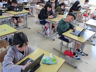 6年生はタブレットの学習ゲーム機能で遊んでいました。友達と画面を見せ合いながら、盛り上がっている子どもたちもいました。