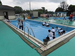 6月6日(木) 今日はあいにくの曇り空のため、昨日ほど気温は上がりませんでしたが、水温、気温共に基準を満たしていたため、5・6年生のプール開きを実施することができました。