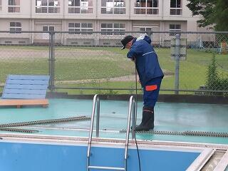 7月3日(水) 先週は雨の日が続き水泳の授業が実施できなかった学年も多かったのですが、天気が回復した今週の昨日と今日は水泳中でも熱中症の心配が必要なほどの天気・気温となりました。あまりにも気温、水温が高すぎても水泳の授業が実施できないため、熱中症指数計を確認しながらの実施判断となります。なんとかプールでの授業が実施できた2年生の子どもたちは、元気にプールでの学習を楽しんでいました。