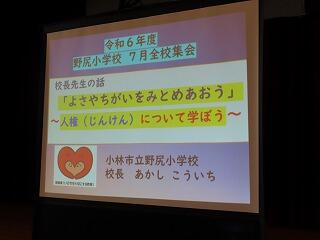 7月1日(月) 今日から7月。朝の時間に7月の全校集会が実施されました。7月1日~7日は「宮崎県いのちの教育週間」です。明石校長から、人権(じんけん)についてや、それぞれのよさやちがいを認め合うことについて話がありました。野尻小の子どもたちが、それぞれの「いのち」を大切にして、「いのち」いっぱいに生きる子どもに育って欲しいと思います。