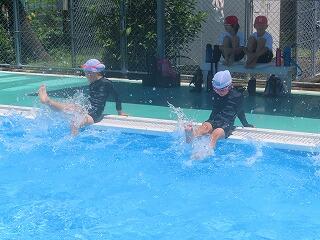 6月11日(火) 高学年と中学年に続き、今日は低学年のプール開きです。朝の時点では曇り空でしたが、2校時プール開きの時間になると日が差してきて絶好のプール日和になりました。1年生は小学校生活初めてのプールでの学習です。プールの約束事を確認した後、水慣れのためにお互いに水を掛け合ったり、じゃんけん列車を楽しんだりしながら、初プールを思いっきり楽しみました。