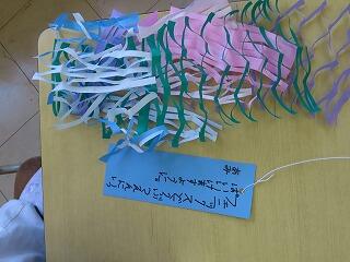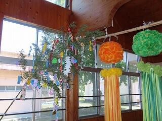 7月5日(金) 更生保護女性会の皆さんからいただいた七夕飾りを使って、1・2年生児童が七夕の飾り付けをしました。短冊にそれぞれの願い事を書いて飾り付けを終えると、わくわく広場(ホール)がとても華やかになりました。先日、家庭教育学級で作成した吹き流しの飾りと合わせて、素敵な野尻小になっています。