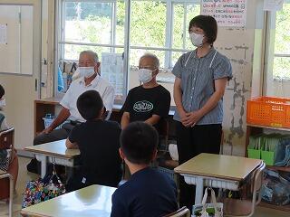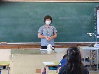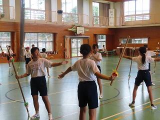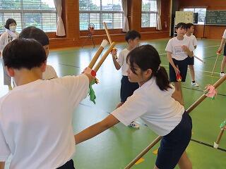 7月8日(月) 今年も「棒踊り」の練習が間もなく始まります。そのため、はじめは「棒踊りの歴史学習」の時間として、その由来や背景、使用する道具について5年生児童が学習しました。外部講師として「新地馬場棒踊り保存会」の会長でもある古川さんをはじめ3名の方に来校して指導していただき、棒踊りへの理解が深まりました。今後は5・6年生が運動会の「棒踊り」の発表に向けて練習に取り組んでいきます。