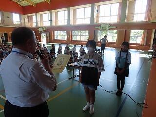 さて、今日は熱中症と感染症予防のため、校内放送による全校朝会を実施し、明石校長から生活リズムを整えること、みんなで互いに思いやりの心をもつこと等についてお話がありました。