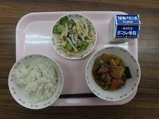 今日は冬至を意識したメニューです。そぼろ煮は、かぼちゃの皮まで食べることができるぐらい、軟らかく煮こまれています。なますは、大根やキュウリ、厚揚げ、昆布、ニンジンが入っていて、ゆずの香りが食欲をそそります。