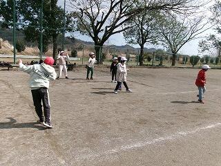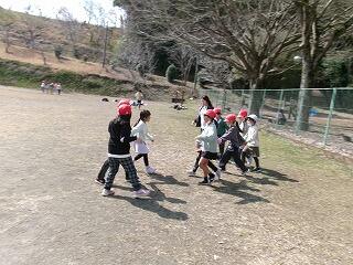 1年生は体育科の学習で、キックベースボールをしていました。守備側は、相手がけったボールをとって指定の場所に集まり、キッカーが1塁ベースにつく前に、「アウト~!」とみんなで叫ぶと得点を阻止するのだそうです。盛り上がっていました!