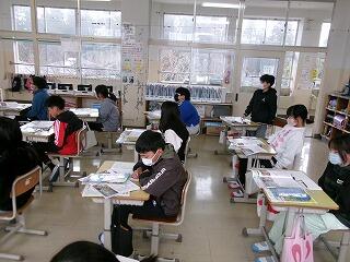 6年生は家庭科の冬の生活を工夫しようという単元の学習で、イラストを見て、どのような点を改善すれば、冬の生活が健康で快適になるかを話し合っていました。なかなかするどい意見がたくさん出されていました。