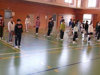 2月16日(金)に、子どもたちが楽しみしていた全校縄跳び大会(8の字跳び)がありました。前半の1・3・5年の部と後半の2・4・6年の部に分かれて実施し、低・中・高学年の部それぞれで優勝チームを決めました。体育運営委員会の司会進行の下に、前半の部が始まりました。「ようい!スタート!」の合図があると、どの学年も一斉に「1、2、3、、、」の掛け声のもと、跳び始めました。縄を回す先生方と縄を跳ぶ子ども、そして、それを見てカウントする子どもたち!どの学年も1つになって競技に挑みました、体育館が熱気に包まれました!後半の部の2・4・6年の部は前半の部の学年の回数を追い越そうと必死に跳び続けました!目標回数が分かっているだけに後半の部は、さらに、ヒートアップしました!どの学年も5分間の8の字跳びに各クラス心を1つに全力で取り組みました。