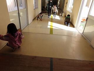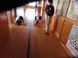 1年生は卒業生が通る児童玄関前の廊下を掃いたりふいたりしていました。