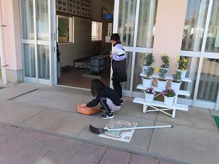 3年生は児童玄関前の庭、児童玄関の清掃をしていました。