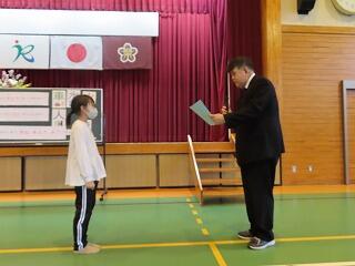 3月26日(火)に令和5年度修了式がありました。学級担任の合図で各学年がその場に立ち、代表者が前に出て修了証を受け取りました。1年から5年生まで92名全員無事に進級することになります。作文発表では、小学1年生児童が今年度の反省を踏まえ、次年度頑張りたいことを力強く発表しました。校長としては各学年のがんばったことを紹介しました。1年生は学校生活にすっかり慣れ、足し算や引き算もできるようになりひらがなを全部覚え、漢字も書けるようになりました。2年生は、掛け算をしっかり覚え、いろいろな場面で、1年生の1つ年上のお兄さん、お姉さんとして見本をみせてくれました。3年生は、新しく始まった学習(習字、リコーダー、総合、外国語活動、社会科、理科など)をがんばりました。4年生は、先生の指示に対して「はいっ!」とみんな一斉に返事ができ、いつもメリハリのある動きで、元気いっぱい学習に取り組みました。3・4年生は突然のアクシデント(バスが相当遅れる)を乗り越え、音楽大会で見事な演奏をしてくれました。5年生は、宿泊学習の経験をいかし、学校のリーダー的存在として、規律・協働・友愛・奉仕の精神をいかして、引っ張っていってくれました。今年1年がんばったことは来年さらによくなるように、また、うまくいかなかったことは春休みにしっかり準備をして、新年度、気持ちのよいスタートがきれるように!と話しました。そして、本年度最後の校歌を全員で元気よく歌って式を終えました。