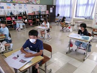 4年生は算数科のテスト、5年生は国語科のテストを受けていました。他の人の答案が見えないように、机の間をはなしたり、向きを変えたりしていました。みんなとっても真剣で、習ったことを振り返り、じっくり考えながら問題に挑んでいました。