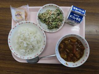今日は、子どもたちに大人気メニューの一つでもある「ハヤシライス」です。豚肉やニンジン、玉ねぎ、グリーンピース、エリンギなどが入っていています。ルーもとても美味しいです。サラダはキュウリやキャベツ、コーンが胡麻ドレッシングで和えてあって、こちらもとても美味しいです。