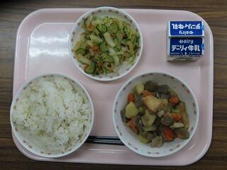 今日は、子どもたちに大人気メニューの一つでもある「ハヤシライス」です。豚肉やニンジン、玉ねぎ、グリーンピース、エリンギなどが入っていています。ルーもとても美味しいです。サラダはキュウリやキャベツ、コーンが胡麻ドレッシングで和えてあって、こちらもとても美味しいです。