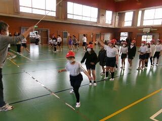 5年生はちょうど学級レクレーションの日で、体育館でクラスみんなで「天下とり」というボールゲームをしていました。ボールの当て合いゲームですが、みんなひるまず立ち向かっていて大いに盛り上がっていました。