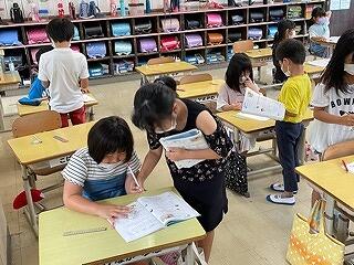 1年生は夏に遊んだことを絵と文に表していました。とっても集中していました。2年生はお気に入りの本についてしらべたことを、メモをもとに発表していました。