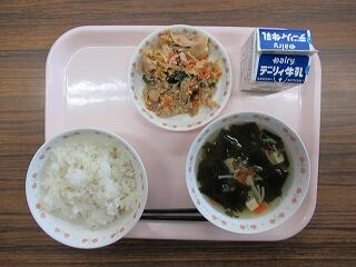 今日は韓国料理のビビンバです。ごはんにかけて食べます。たっぷりの豚肉やもやし、ホウレンソウ、ニンジンなどが入っていて、甘辛い味付けでごはんによく合います。スープには、ワカメや豆腐、ニンジンなどが入っていて、こちらもご飯とよく合います。