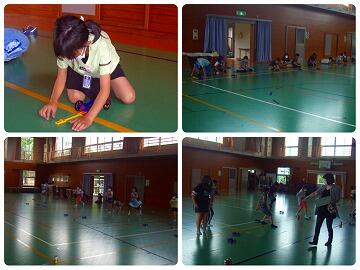 体育館に距離を変えて作った駐車スペースに、ゴムに加える力を加減して、駐車させる実験を行いました。一列に並んで発進させたゴムカーがどの駐車スペースに停まっているか、みんな走って見に行ってました。