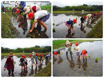 今回は、野尻保育園のお友達が一緒に手植えを体験しました。泥だらけになっていましたが、とても楽しそうに植えていました。
