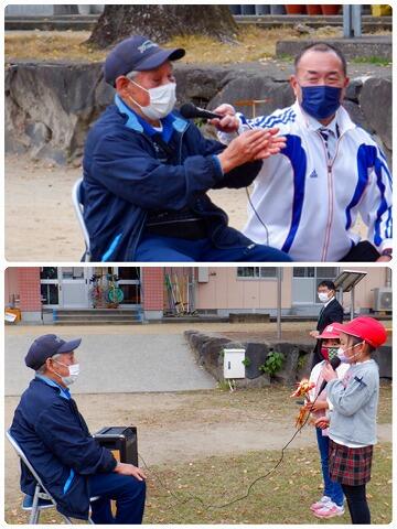 白坂様から野尻町内の小学生全員に一人一本ずつ竹とんぼの贈呈がありました。「くれぐれも怪我をしないように気を付けながら楽しんでください。」とお話がありました。