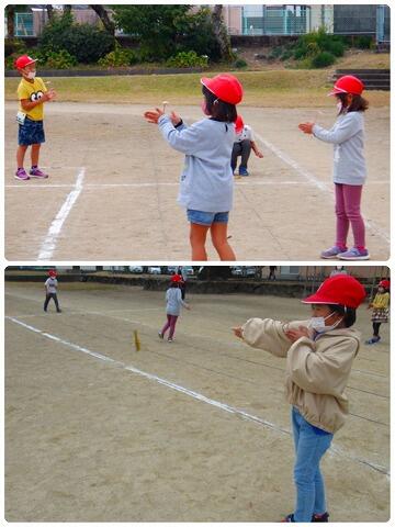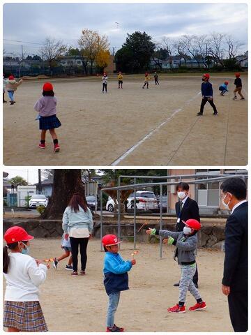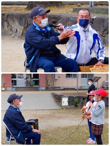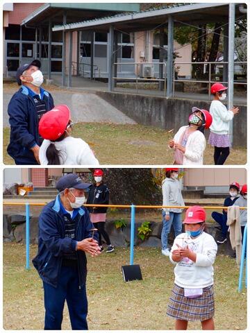 贈呈式後、頂いた竹とんぼを飛ばして遊びました。竹とんぼの飛ばし方を教えてくださった白坂様に「どうしてそんなに飛ばせるの?」と、びっくりする児童もいました。